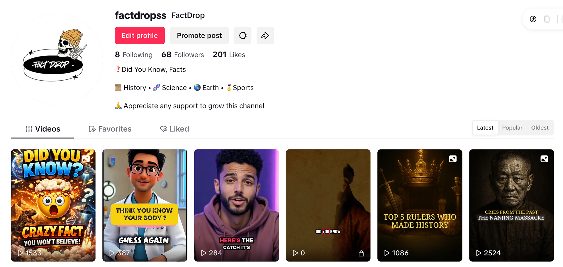 I run a TikTok channel that shares quick, engaging facts about history, science, sports, and more. Each post combines AI-generated visuals with simple storytelling to make learning fun, creative, and visually striking.